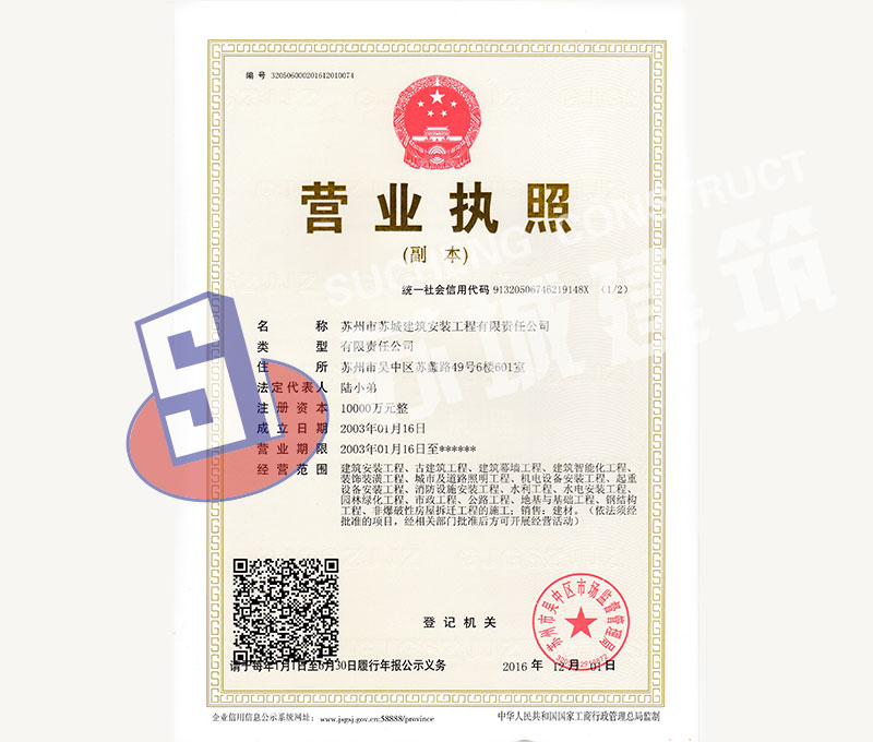 蘇州市蘇城建筑安裝工程有限責任公司,擁有主項建筑工程施工總承包一級資質,增項市政公用工程施工總承包二級資質和建筑裝修